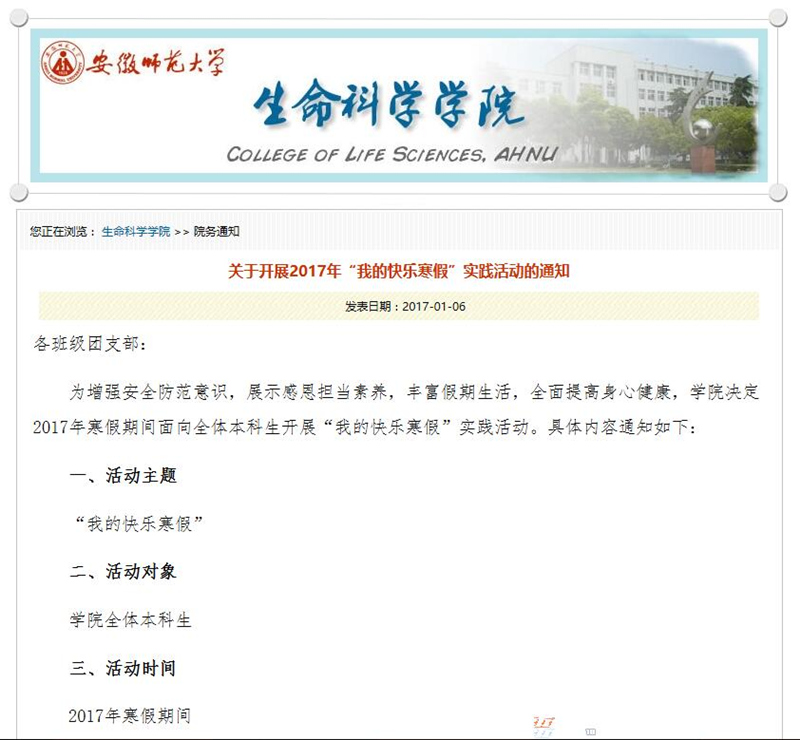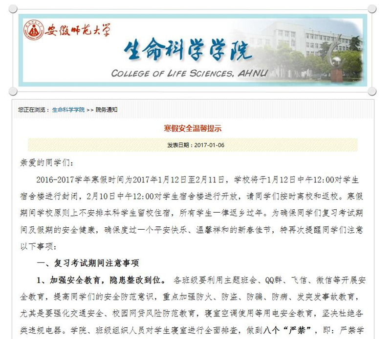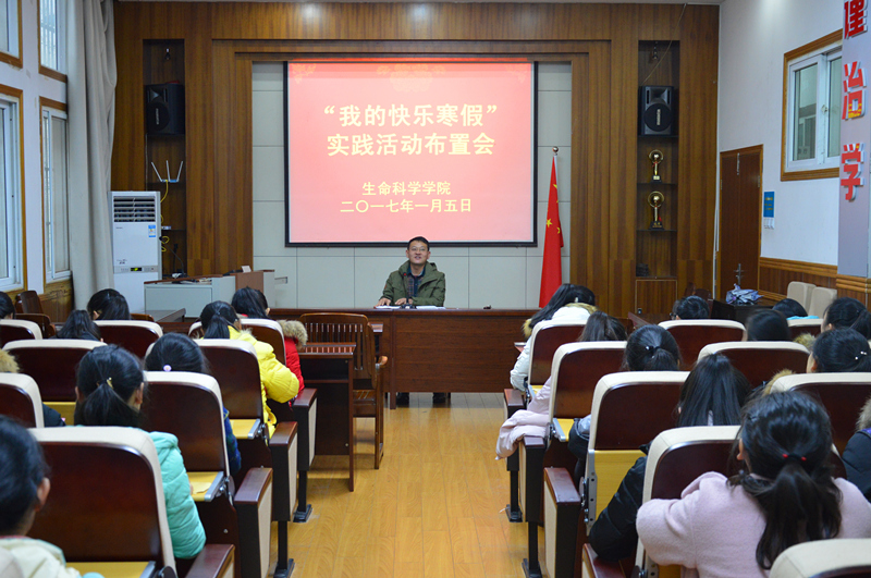 放假前,各班级召开主题班会进行活动布置,通过学院网站、班级QQ群、微信群发布《寒假安全温馨提示》、《关于开展2017年“我的快乐寒假”实践活动的通知》,加强安全宣传教育,引导学生平安快乐度过假期。要求每位同学认真完成活动内容,通过@安师大生科院学生会官方微博的形式进行互动,设单项奖和组织奖,进行表彰奖励。同时,为进一步探索家校联动,共同育人的机制,学院还精心制作《致学生家长的一封信》,感谢家长对学生工作的理解和支持,介绍学生一年来在校学习生活的基本情况,并征求他们对学生工作的意见建议,形成合力共同帮助大学生快乐生活健康成长。