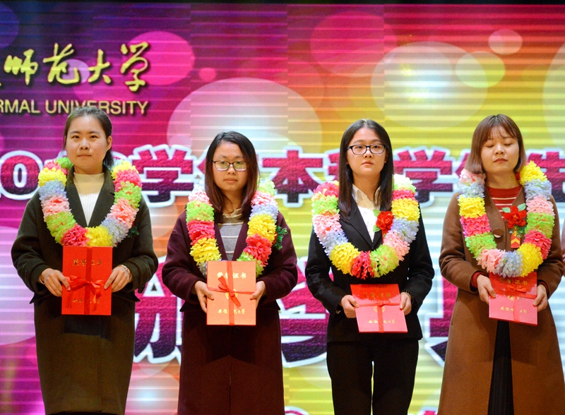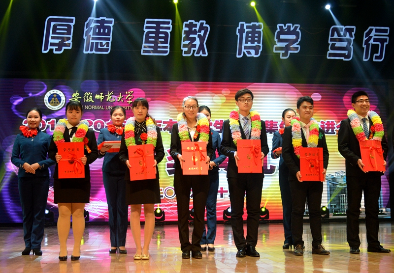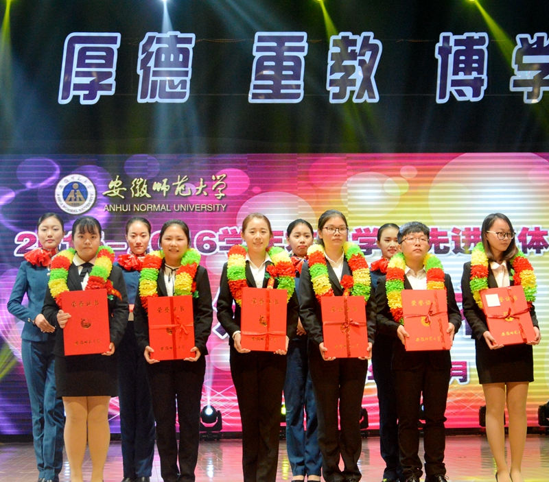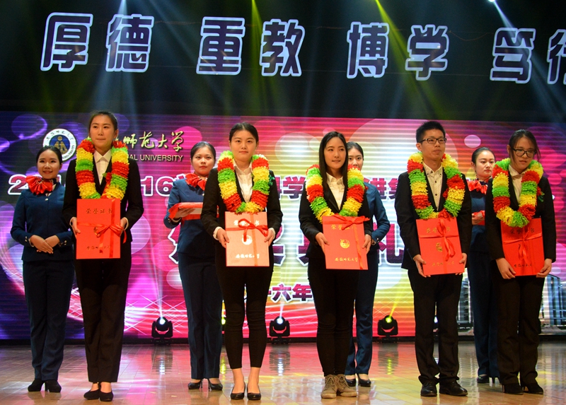 典礼激发了永利学生先进集体、先进个人的荣誉感和自信心、自豪感,激发了全院学生努力学习、奋力拼搏、励志成长的责任心、成才志和报国情。多年来,生科学子以优异的成绩连续在学校先进集体、先进个人年度表彰中获得骄人荣耀,其中,2012—2013学年获9批次表彰(11批次颁奖),2013—2014学年获9批次表彰(9批次颁奖),2014—2015学年获9批次表彰(10批次颁奖)。可喜的是,永利学子“全国十佳大学生提名奖”和“中国大学生自强之星提名奖” 获得者,“师大骄子”十佳大学生、校第五届大学生自强之星朱承节应邀作为嘉宾在颁奖典礼上宣读获奖名单。2016年,学院以总分第一的成绩获学校“就业工作先进学院标兵”荣誉,院长吴孝兵代表获奖单位在颁奖典礼上发言。