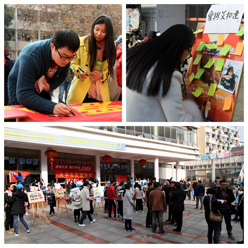 11月30日、12月1日,生科院、校医院联合芜湖市防艾办、芜湖市卫计委、芜湖市疾控中心、芜湖市出入境检疫局、镜湖区卫计委、镜湖区疾控中心、弋江区卫计委、弋江区疾控中心及生科院大学生保健协会、物电学院爱心服务团队、经管学院新雷锋志愿者协会、历社学院社会工作协会等各级组织,多方协助、通力合作,在全校营造艾滋病防控宣传氛围。志愿者们通过配合医生开办防艾现场咨询会、并结合宣传橱窗、展板、宣传手册、微信、微博等形式,线上线下,齐头并进,向在校大学生宣传防艾滋知识,帮助其了解艾滋病防控知识,培养艾滋病防控意识,引领更多青年大学生担当社会责任,使积极参与到“携手防艾重在预防”宣传教育和行动中来。现场学生反映,由学生自己组织开展的活动,受到大学生的积极响应和踊跃参与,进一步增强了他们艾滋病防治意识,提高了预防艾滋病及反歧视理念宣传自觉性,并能将知识和理念转化为个人行为,可以有效降低感染艾滋病的风险。
