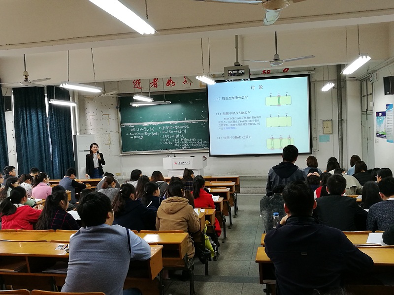 本次课程内容是《微生物生理学》中的重难点之一。杨安娜老师首先通过回顾学生熟悉的动、植物细胞的分裂过程来导入本节课的主旨内容,并进一步复习了细菌主要的增殖方式。随后介绍了革兰氏阴性菌的细胞分裂过程,重点阐述了细胞分裂蛋白FtsZ的功能及其介导的细胞分裂过程,Min蛋白在细菌细胞分裂中的摆动模型,Z环定位的基因调控方式。杨老师在整个课程中激情饱满、讲解流利,不断用精心设计的提问和设问来引导和启发学生思考,使得课堂教学气氛非常活跃,课堂的最后还通过做练习题的方式,不但总结了所授内容,更进一步让学生能熟练运用所学知识去解决实际问题,取得了较好的教学效果。