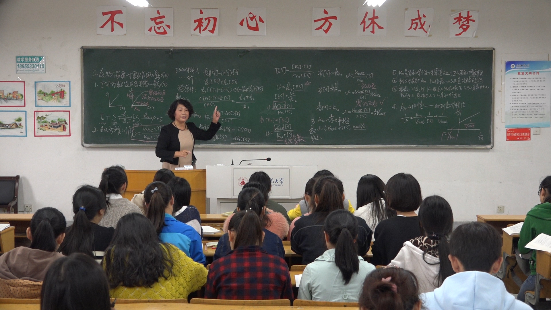 本次课程内容比较抽象,是《生物化学》中典型的教学难点之一。张庭廷老师首先与同学们一道回顾了与本次课相关的背景知识,接着从底物浓度对酶促反应速度的影响角度,引入米氏方程,对方程进行了推导演绎,对方程中关键参数米氏常数的特点和生物学意义给予了揭示,指出了米氏常数的测定方法;最后张老师对课堂进行了总结回顾,并布置了相关课程作业。张老师课堂组织有序,精心设计的提问和设问不断地引导和启发学生思考,学生兴趣高昂;她语气温和,声音洪亮,板书设计精心,充分利用黑板版面,字迹优雅流畅,版图清晰,展现出深厚的教学基本功力;整节课全部采用板书教学未使用多媒体,而是在黑板上一步一步推导和讲解;教学内容详略得当,对方程演绎推导等教学重难点讲述清晰,逻辑性强。通过本次教学,学生对抽象的知识点有了理性的认知,取得了良好的教学效果。