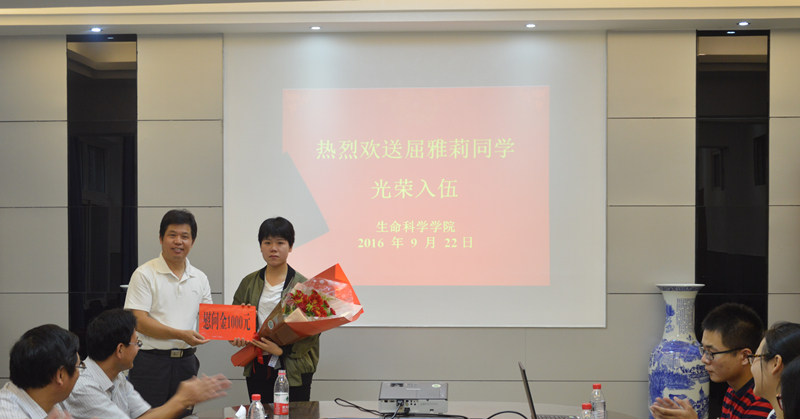 屈雅莉,女,2014级生物技术专业学生,班级团支部书记,大学生保健协会副会长。曾获校三等奖学金、安科生物奖学金。欢送会上,屈雅莉同学激动的汇报了自己响应国家号召光荣应征入伍的体会和梦想,表达了参军报国的决心和信心,表态将牢记母校的培养、祖国的期望,努力学习锻炼成长,为强军梦强国梦建功立业。辅导员、教师和学生代表深情的回顾了和屈雅莉在校学习期间相处的美好时光,抒发了即将离别的依依不舍之情,表达了美好的祝福祝愿。