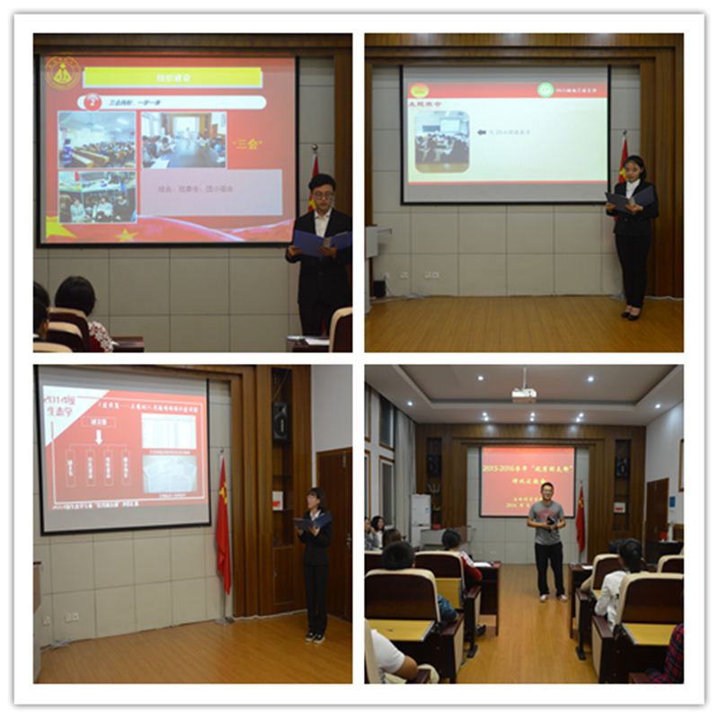 本次汇报共有14个团支部参与评选,其中2014级团支部7个,2015级团支部7个。各团支部围绕思想建设、组织建设、制度建设、班级学分建设和素质拓展工作五个方面,通过PPT展示,全面介绍支部的创建、发展情况,同时也展现出各支部成员积极向上的风貌和取得的丰硕成果。选手们各具特色的汇报演讲赢得了热烈掌声。评比结束后,团委书记赵喆作总结点评,肯定了各支部在团建中的成绩,同时也指出了存在的问题。希望各团支部在新学期抓住主题教育为契机,以学风建设为重点,打造学习型、服务型团支部,为学院团的建设和团员成长成才添砖加瓦。