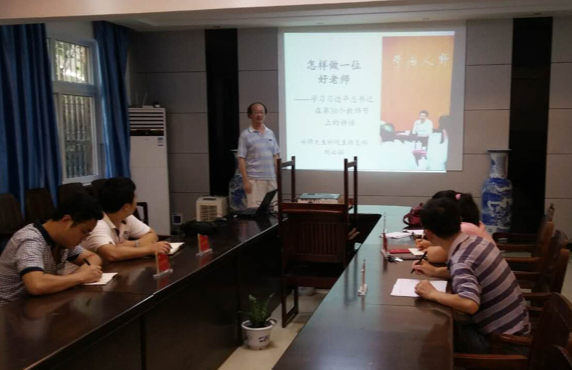 首先,刘必融同志为支部成员讲了一堂以“怎样做一位好老师”为主题的生动党课。以习近平总书记在第三十个教师节北师大座谈讲话为基础,着重介绍对教师“仁爱之心”的理解。强调教师在与学生相处的过程中要做到“宽严相济”,一名好教师要做到忠于职守,多与学生交流探讨,不对学生做苛刻要求,包容学生等。在讲课过程中,刘老师结合自身工作,分享在实际教学中处理问题的方式方法,从理论和实际两个方面阐释了“怎样做一位好老师”这一主题。