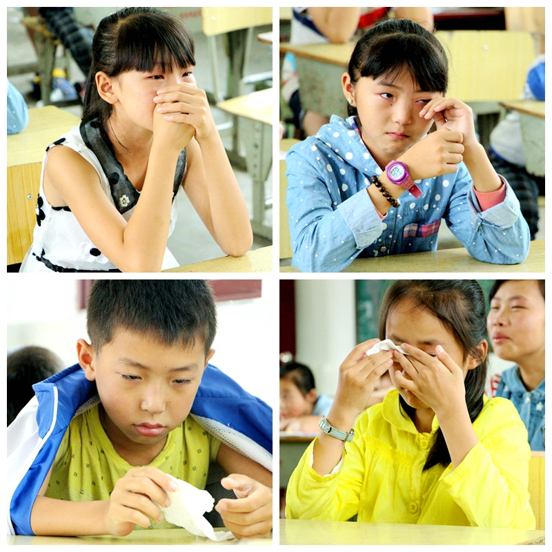 随着歌曲《烛光里的妈妈》、《时间都去哪儿了》的响起,一段漫画视频短片展示了我们从呱呱坠地到学会吃饭、写字到慢慢长大以及父母慢慢变老的全过程。志愿者们也强忍住泪水,循循善诱,为孩子们述说了珍惜爱、感恩爱的小故事。《天堂的午餐》让孩子们学会珍惜现在拥有的爱,《最好吃的饭》更是诠释了一位白内障母亲对女儿深深的爱——踏过千山万水,却只是想让生病的女儿吃上一顿自己做的饭。孩子们变得沉默了,从刚开始的嘲笑别人哭了,到后来自己的眼眶红了,再到后来的泣不成声,这一幕幕,让志愿者们看了也好心疼。