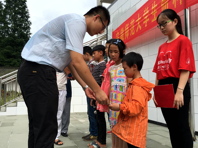 仪式上,洪雅县关工委周明弟代表作了发言,他首先代表洪雅县人民政府对安师大爱心支教团队能克服重重困难、不远万里来到洪雅开展爱心支教活动表示衷心地感谢,并对支教团队6年来的工作给予了高度肯定。他还勉励了几位受助学生,鼓励他们在学习上勤奋刻苦,生活上积极进取。赵喆代表团队向关心和支持安徽师大“红烛行动”爱心支教的社会各界表示感谢,同时承诺,团队全体成员定会珍惜实践机会,尽心尽力地做好各项工作,将“红烛行动”爱心的接力棒传递下去。