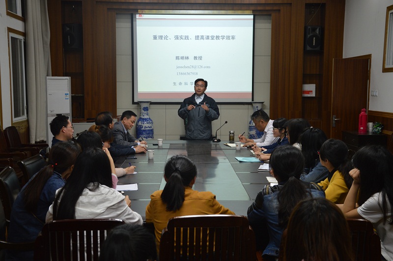 (3044am永利集团官网 杨马荣) 为了提高师范生的教学技能,同时促进第二届全日制教育硕士教学技能大赛的顺利进行,永利于2016年5月9日晚19点在生科院一楼会议室邀请了陈明林教授做了关于如何提高课堂教学技能的讲座。出席本次讲座的有部分研究生导师、教育硕士专业研究生和部分本科生,本次讲座由汪鸣老师主持。