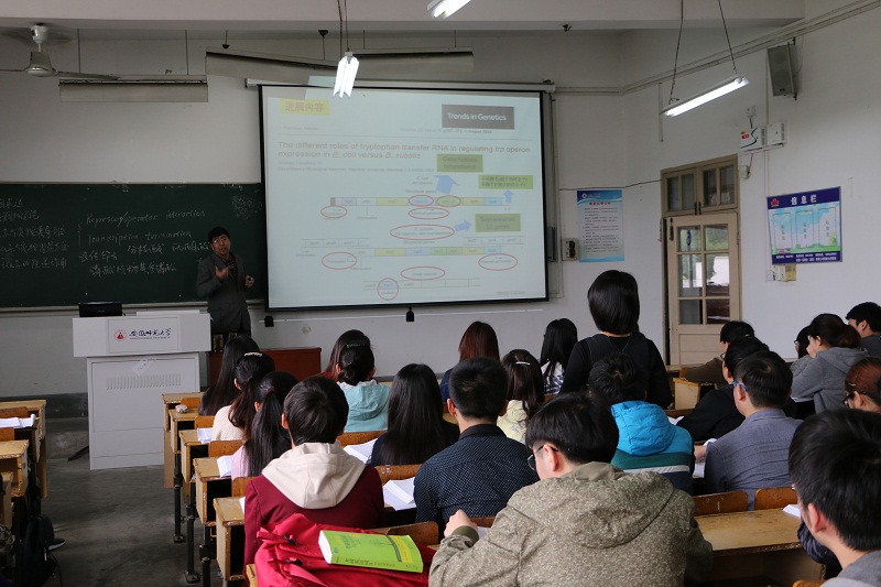 本次公开课主要授课内容为“乳糖操纵子lac与负控诱导系统”和“色氨酸操纵子与负控阻遏系统”。阚显照老师首先回顾了“操纵子、弱化子”等重要知识点,分析对比了可诱导操纵子和可阻遏操纵子所产生的不同生物学效应。主动引导学生思考,以双语教学为基本,内容衔接流畅。着重与学生讨论、比较阻遏物对于不同操纵子影响以及色氨酸操纵子中特殊的终止茎-环结构,加强课本前后知识点的衔接。他遵循着对知识“知其然,且知其所以然”的态度,使得复杂的操纵子系统变得通俗易懂,便于同学的理解与记忆。最后,阚老师利用课堂小结的时间鼓励大家多多观看英文文献,了解生物领域在操纵子方面的最新进展,多登录NCBI查询资料信息,帮助同学们提高生物科学兴趣。