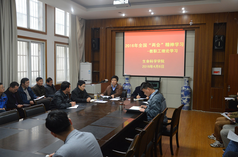 (本网讯 汪倩倩)4月6日下午,生科院召开全体教职工大会,传达相关会议和文件精神,集中进行了2016年全国“两会”精神学习,为学院发展凝聚共识、汇聚力量。院领导班长成员和全体教职工参加了会议,会议由院党委书记蒋学波主持。