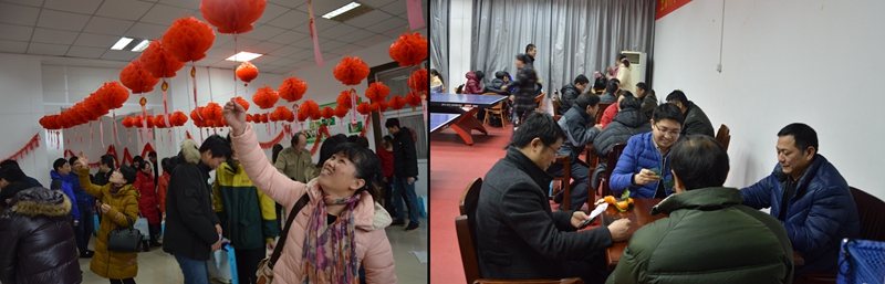 游园活动精彩纷呈。“书写新年愿望”,记录了愿景,传达了祝福;“羊年幸运大转盘”,送出大礼包,传递大幸福;“猜灯谜”,蕴含十足,妙趣横生,展示了智慧、收获了欢乐;“套圈”,扔出小圈,套住希望;“踏过指压板”,踏过时龇牙咧嘴、完成时欢声笑语;“弹球”,弹走的收获满满的2015,接到的是充满希望的2016…… 现场氛围浓厚、其乐融融。“掼蛋”比赛紧张激烈,选手们精确计算、谨慎出牌,队友相互协作、默契配合,掼出了水平,打出了风采。比赛项目,着实精彩;参赛老师,个个给力;比赛现场,热闹欢腾。经过五个多小时的喜庆角逐,游园活动和扑克牌比赛圆满落幕。
