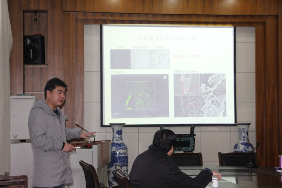 第一场学术报告在学院一楼会议室举行,学院朱国萍副院长主持报告会。张根博士的报告题目是“蛋白组学在生物污损中的应用—p38 MAPK和NO影响纹藤壶附着的分子机制”,他着重介绍了使用无标记蛋白组学的方法,研究p38 MAPK和一氧化氮的两个信号通路如何影响纹藤壶的部分生理功能和代谢过程,以及这两个信号通路的共同下游基因(精氨酸激酶和附着诱导蛋白复合物)的功能。
