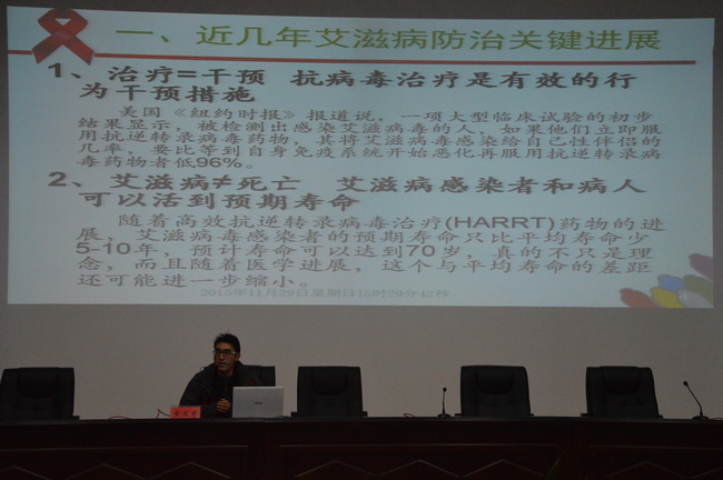 讲座前,刘振杰结合参会经历,详细地为同学们解读了由中国性病艾滋病防治协会、中国健康教育中心、中国疾病预防控制中心、共青团中央权益部、中国高教学会共同主办2015年世界艾滋病日主题宣传暨“美好青春我做主”红丝带健康大使青春校园行活动的有关精神。刘振杰指出,目前我国青年学生艾滋病疫情增长较快,希望广大青年学生行动起来,积极参与到抗击艾滋病的行列中来,让艾滋病远离大学生,远离青年,向零艾滋迈进。