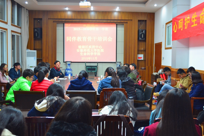 共担责任铸造坚固防线 11月30日,在校医院、镜湖区疾控中心的指导下,大学生保健协会开展了2015年同伴员骨干培训会。会上,刘振杰强调,开展预防艾滋病宣传教育活动,要与性健康教育有机结合,将性道德、性责任、预防和拒绝不安全性行为作为重点,切实提高学生的自我防护能力,让青春更健康,让人生更精彩。他号召每一位生科学子积极行动起来,发挥骨干力量,“合力抗艾,共担责任,共享未来”,为早日实现零艾滋贡献青春正能量。段萍指出同伴教育对高校大学生艾滋病防治工作具有十分重要的意义,希望广大同伴员能够深刻认识同伴教育的作用,掌握系统的预防艾滋病知识,提升处理同伴压力与交流的技能,帮助更多的大学生了解艾滋,远离艾滋。