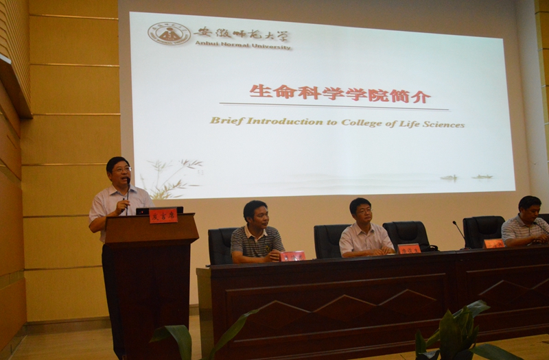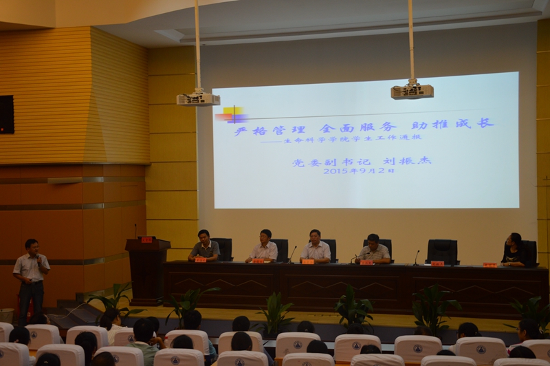 随后,院党委副书记刘振杰从招生就业考研情况、工作思路管理队伍、安全管理学业指导、入学教育成才引领、分类指导促进就业、学生干部党员发展、奖助学金困难资助等七个方面详细介绍了学院学生工作。多年来学院毕业生考研录取率位居全校前列,录取院校层次较高,尤其是2015届高达49%,两个专业超过60%,再次名列全校第一,极大的鼓舞了新生勤奋学习、努力奋斗的热情。近三年来学院学生和学生工作都取得了喜人成绩,先后获得国家级和省级荣誉100多项。2012-2013学年学校本科学生工作表彰11个批次,学院先后9批次登台领奖 。2013-2014学年学生颁奖典礼9个批次表彰全部获奖,也是全校唯一一个收获全部荣誉的学院。荣誉有力彰显了学院人才培养的丰硕成果,也树立了新生前进的方向和奋斗的目标,提振了他们敢于成才成功的精神和信心。最后,他介绍了学院81级校友、中国科学院上海生命科学研究院副院长韩斌院士去年回母校与生科学子交流,并题字“诚恳做人,勤奋做事”,寄语激励新生坚持学习实践必有成就。