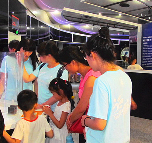 两路多观科技馆,赏当今科技之光 7月12日,实践调研团队前往合肥市科技馆进行科普宣教活动。同学们兵分两路,馆外同学们与前来参观的小学生旅行团互动,并了解他们对生物知识的了解程度,与此同时也向他们普及生物知识,分享生物奥秘。馆内,很多小学生向同学们询问生物有关知识,同学们认真倾听耐心解答,并带领小学生们学习了科技发展史与科学家的创新精神。