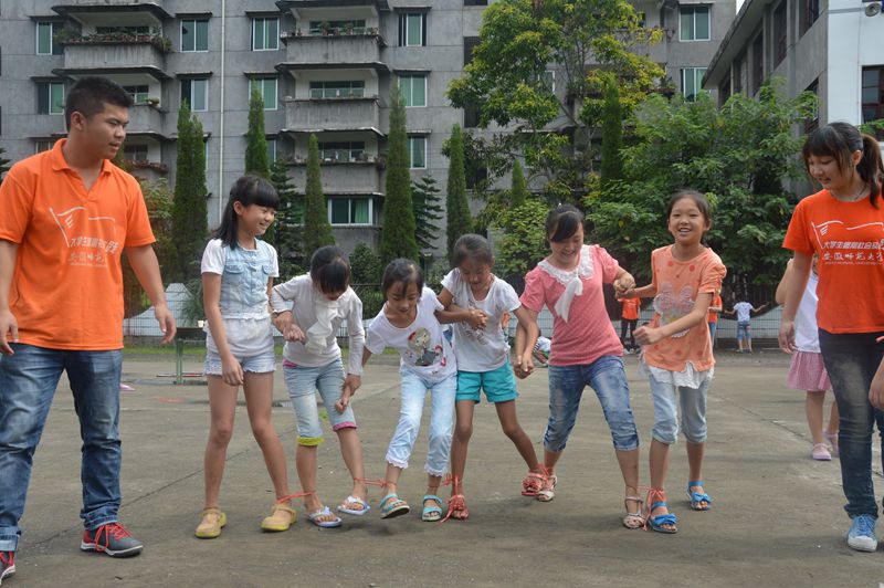 众志成城,五人六足手牵手。为让孩子理解体育中团队合作意识,团队开展了“五人六足”的游戏。伴随着志愿者们“一二,一二”的节奏声,孩子们你拉我扯,争先恐后,队伍却停滞不前。经志愿者手把手、脚并脚的示范,孩子们心领神会,他们手拉手、肩靠肩,步伐逐渐整齐划一,观赛的小朋友们也在旁边助威和呐喊。当看到他们完成比赛后,脸上洋溢的幸福的笑容,志愿者露出了会心的微笑:“团队意识在不经意间产生”。