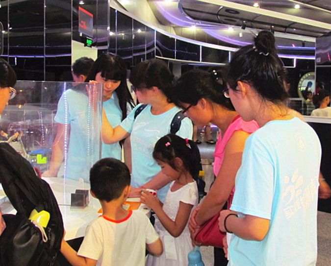 活动当天,团队学生兵分两路,馆外学生进行生物知识调查与普及,馆内学生进行调研与宣传。馆外,同学们与前来参观的小学生旅行团互动,调查他们对生物知识了解程度的同时又普及生物知识,分享生物奥秘。馆内,许多小学生们不断向同学们询问生物相关问题,同学们认真倾听耐心解答,并带领小学生们学习了科技发展史和科学家的创新精神。