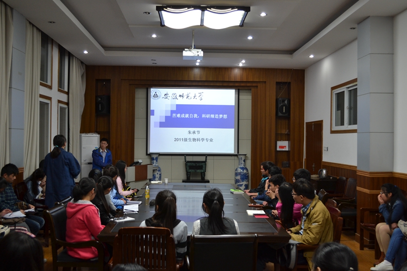 学习先锋模范,争做当代学子。为深切感受大学生的责任与义务,4月23日晚,永利3044noc第五届“自强之星”2011级生物科学专业朱承节同学为2014级新生开展了题为“苦难成就自我,科研缔造梦想”的报告会。会上,朱承节同学结合自身成长历程分别从跌宕人生、勤奋自强、感恩社会、奉献他人四个方面向同学们全面深刻地阐述了当代大学生的责任与义务。同时鼓励大家利用课外实践、科研创新、社区服务等形式提升自身的综合素质,创造丰富多彩的大学生活。