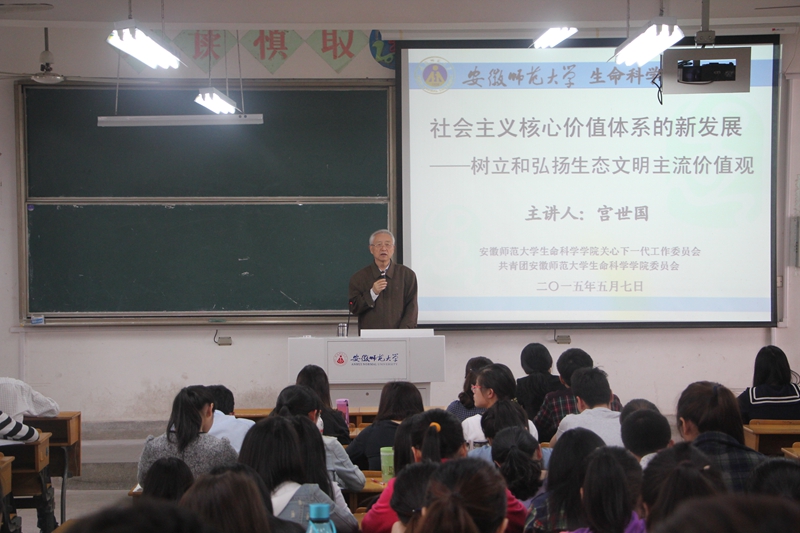 本网讯(生科学院 汪倩倩)5月9日下午,学院关工委邀请校关工委报告团成员宫世国教授为学生作了题为“社会主义核心价值观体系的新发展——树立和弘扬生态文明主流价值观”的报告。学院本期党员培训班部分成员、2013级各专业学生代表聆听了报告。报告会由学院关工委办公室主任、团委书记汪倩倩主持。