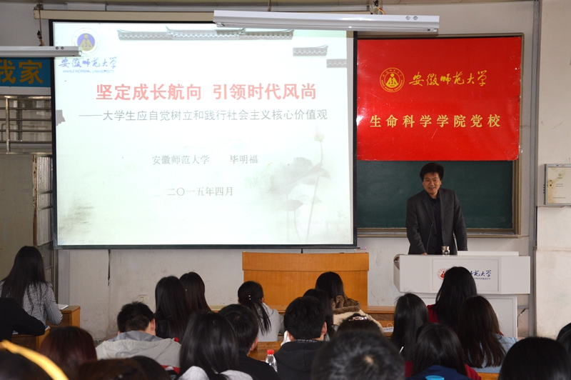 本网讯(生科院 方鑫 张磊)4月18日上午,校党委常委、副校长毕明福应邀为生科院第2期学生党员培训班作了“坚定成长航向,引领时代风尚”的专题报告,强调了大学生党员应自觉树立和践行社会主义核心价值观。