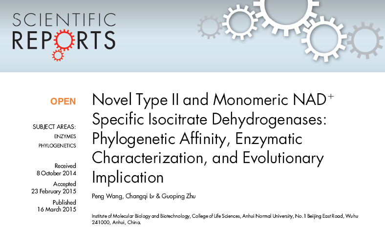 2. 论文题目为《Novel type II and monomeric NAD+ specific isocitrate dehydrogenases: phylogenetic affinity, enzymatic characterization, and evolutionary implication》(Scientific Reports, 2015, 5: 9150, DOI: 10.1038/ srep09150)。论文第一作者是3044am永利集团官网青年教师王鹏,通讯作者为朱国萍教授。王鹏于2012年博士毕业,2014年晋升副教授和硕士生导师,2014年底前往美国University of Alabama at Birmingham医学院从事博士后研究。
