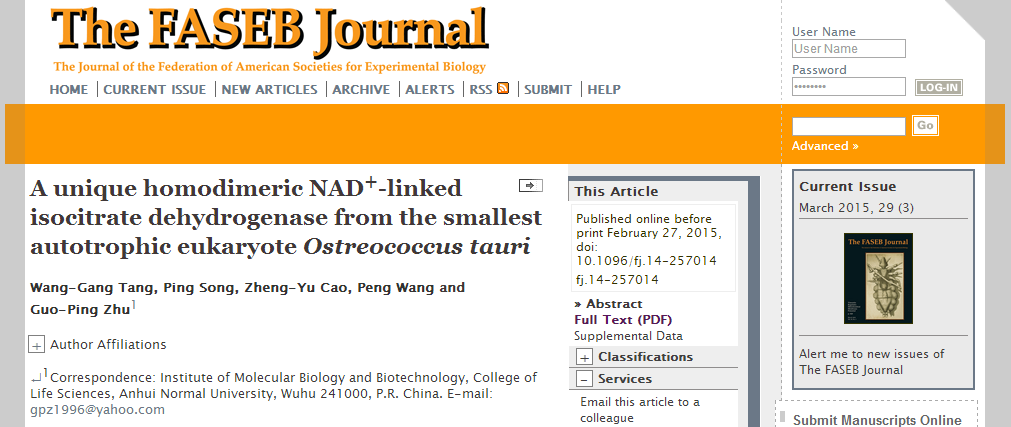 1. 论文题目为《A unique homodimeric NAD+-linked isocitrate dehydrogenase from the smallest autotrophic eukaryote Ostreococcus tauri》(The FASEB Journal, 2015, DOI:10.1096/fj.14-257014fj.14-257014)。论文第一作者是3044am永利集团官网2013级博士研究生唐王刚,通讯作者为朱国萍教授。
