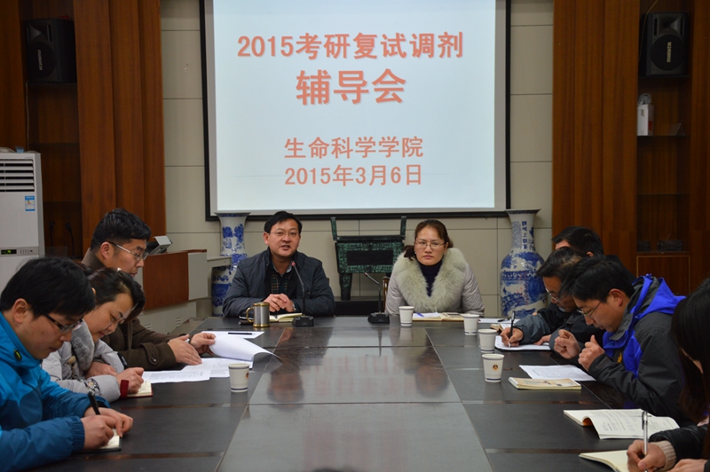 本网讯 (生科院 蒋澜、郭志春)为帮助考研学生更好的准备复试或调剂,3月6日,学院召开2015届毕业生考研复试调剂辅导会。院党委副书记刘振杰、副院长朱国萍,专业负责人陈明林、刘爱民、肖家欣、王友保、阚显照,毕业班辅导员郭志春和2015届全体考研同学参加了辅导培训,辅导会由刘振杰主持。