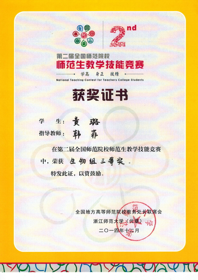 12月13日至14日,第二届全国师范院校师范生教学技能竞赛在浙江师范大学举行,来自全国31个省、市和自治区79所高师院校的311名优秀选手参加比赛。其中永利2011级生物科学专业黄璐同学作为我校6名选手之一参加了此次比赛,并获得了生物组三等奖第二名的优异成绩。