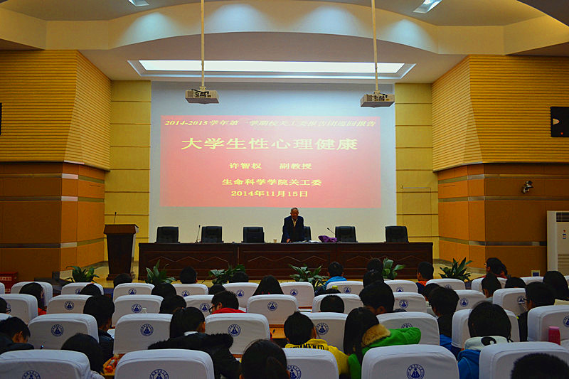 11月15日下午,学院关工委邀请校关工委委员、教科院退休教师许智权副教授在科技礼堂作了《大学生性心理健康》主题报告。报告由辅导员赵喆主持,学院团委书记、关工委秘书汪倩倩以及2014级全体本科生出席并聆听了报告。