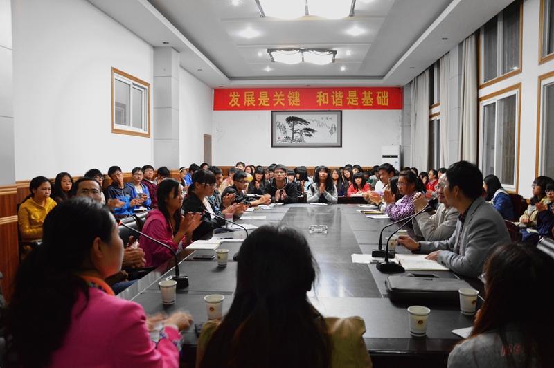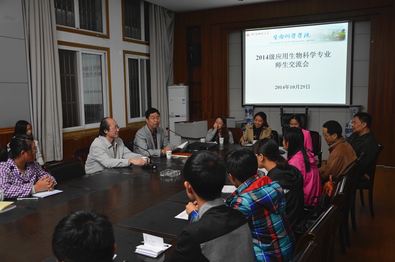 本网讯(生科院 蒋澜 赵喆)10月29日晚,2014级应用生物科学专业在生科院一楼会议室成功举办了一场师生交流会。交流会由应用生物科学系主任阚显照教授主持,许岳慷教授、陈冬生副教授、刘必融老师、赵喆老师及研究生代表应邀出席交流会。