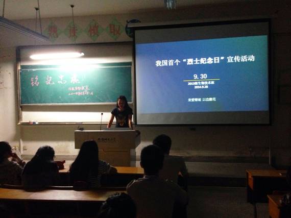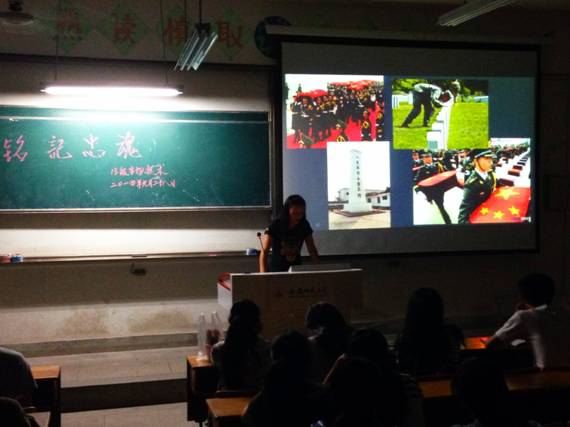 9月28日晚上7时,2013级生物技术专业全体同学在田家炳教学楼8103教室举行首个“烈士纪念日”的纪念活动,活动由团支部书记沙玲珑主持。