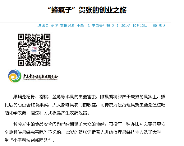 报道称,自2009年开始,生物技术专业的贺张在胡好远教授的指导下开始从事寄生蜂生物防治果蝇的研究。2013年,贺张和他的创业创新团队成功注册了“芜湖中贺生物技术有限公司”,公司所采用的“寄生蜂”生物防治果蝇实验在宁波市、余姚市、慈溪市等千亩杨梅园中得到推广,使杨梅园果蝇的数量减少了80%以上,得到当地政府部门和果农们的一致认可。今年9月份,贺张的“中贺生物创新团队”喜获大学生中国青少年科技创新奖“小平科技创新团队”荣誉称号。