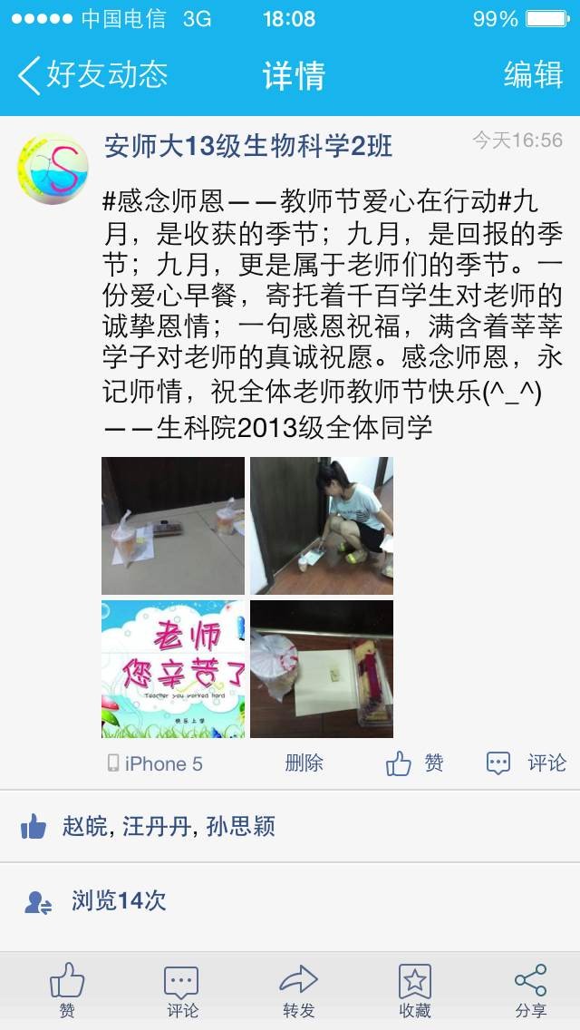 多个平台发祝福。在教师节来临之际,同学们在QQ空间、博客里发表了多个关于感恩教师节的节日祝福,大家都纷纷点赞支持;在微博里,同学们自创主题,写下最美的“三行感恩诗”祝福语。不敢亲口说出的祝福,内心深深掩埋的情感,化作几句诗歌,缓缓流进老师们的心中。诗句简单明了,但饱含深情。