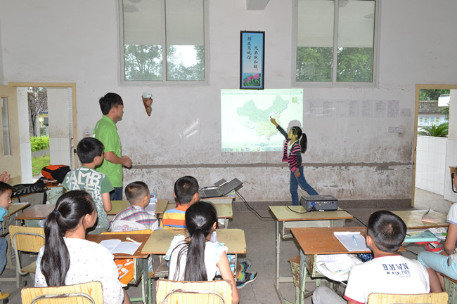 品味完安徽的文化盛宴,同学们又在志愿者们的启发下一起体会四川的风土人情。孩子们兴奋地在中国地图上指出自己家乡的位置,热情地给志愿者老师介绍闻名中外的峨眉山、福泽千年的都江堰、俊秀静宁的九寨沟、独具魅力的少数民族。在孩子们的讲述中志愿者们也对四川有了更多的认识,深深地爱上了这片土地。为了强化学习效果,志愿者还带领孩子们玩了“指点江山”游戏,孩子们在欢快中巩固了所学知识。