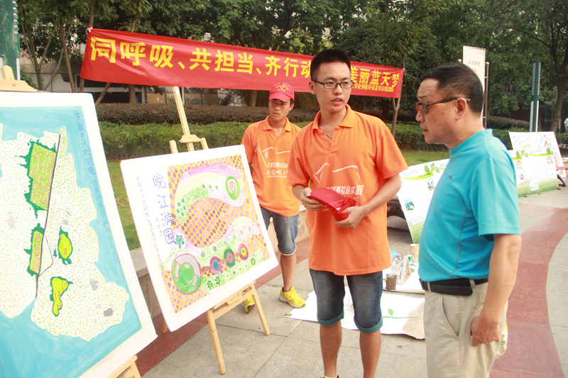只有走进基层才能真正的听民声、知民意。7月6日,队员们先后走进铜陵市郊区大院村和涧湾村开展了走访调研和问卷调查活动。活动过程中,向农民群众宣传环保理念,传播雾霾的形成原因及危害,培养村民们环保意识。7月8日,队员们在铜陵市植物园和螺狮山广场开展了调研活动。调研期间,团队认识到城市居民参与度和热情度远远高于农村,而农村的污染度却不亚于城市。一位队员说:“在看到孩子们纯真的笑脸和对环保知识的渴望时,我突然意识到做环保事业的责任感,因为我不希望孩子的眼中是灰色的”。