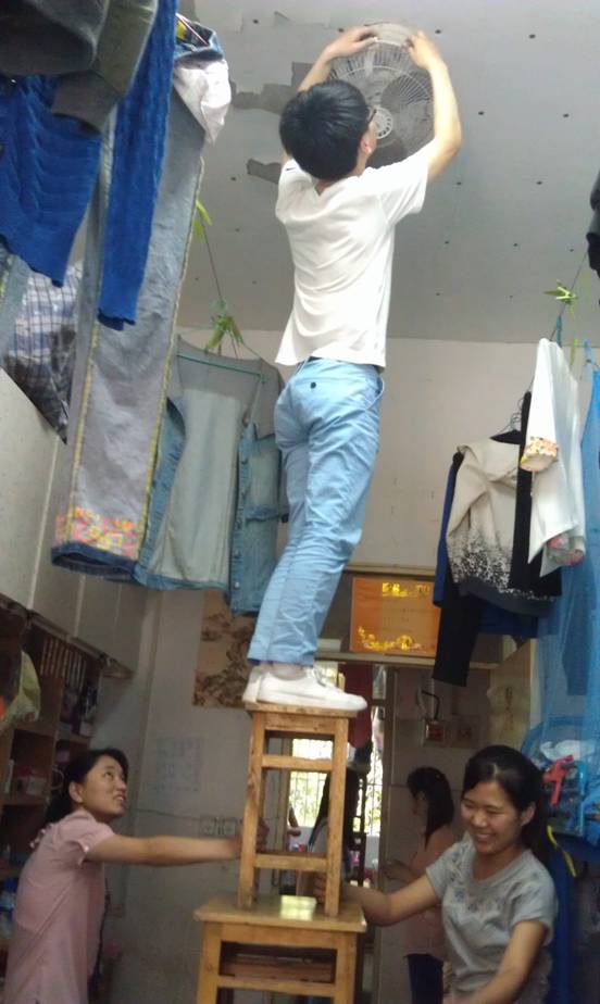 本网讯(生科院 李珍)除去灰尘送来清风,留下回忆营造温馨。夏日来临,学生宿舍开始用起了电风扇,但大多电风扇却布满灰尘和难以清理的污垢,长期使用对宿舍的环境造成不良的影响,且使电风扇容易损坏。为营造干净温馨的宿舍环境,5月26日,2011级生物科学专业男生主动帮助女生寝室清洗电风扇,受到女生同学的欢迎。