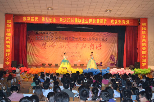 用歌舞回忆过往,以责任担负未来。伴随着轻快悠扬的大合唱《校园的早晨》,毕业晚会正式拉开帷幕。大学生保健协会选送的手影舞《栀子花开》惟妙惟肖,光与影的交叠,将人们带入如梦如幻般的胜境,诠释了生命的科学,描绘了人生的华彩。院舞蹈队带来的《生命礼赞》震撼人心,用青春和激情讴歌了对生命的赞美,展现了生科学子积极向上的精神风貌。歌曲串烧《独角戏》、《锦鲤抄》、《罗密欧与朱丽叶》、《睡在我上铺的兄弟》明亮轻快,用优美的旋律奏了生命的乐章,表达出对美好未来的向往与追求。大学生考研行动协会编排的情景剧《光阴的故事》回忆了大学四年的美好时光,演绎了相知相守的同窗真情。院舞蹈队的舞蹈《爱之永恒》轻盈优美、羽衣蹁跹;2012级生物技术专业曹蕾等同学的《快乐青春》青春洋溢、活力四射;2013级生物科学专业同学的《冰与火》给观众呈现了“冰”与“火”两个不一样的二重世界。2012级生物科学同学演唱的《长大后我就成了你》表达了对师长的敬仰与感激;生科院合唱队演奏的《毕业晚会》,传达了毕业离别时的惆怅与不舍。2014届毕业生孟志一曲《夕阳之歌》,饱含深情,用歌曲表达了对母校的留念,唯愿同窗彼此珍重,共盼他日再相逢。晚会精彩纷呈,现场掌声不断,喝彩阵阵,笑声连连。