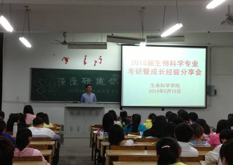 本网讯(生科院 黄璐 李珍)2014届考研帷幕刚刚落下,2015届同学再掀考研成长热潮。5月15日,2015届生物科学专业同学邀请环科学院考研八连发“学霸寝室”辅导员兼学生处秘书左方敏,2014届生科学子中科大研究生郭薇薇、浙江大学研究生王丹、华东师大研究生许璐、上海生化所研究生姚贺帮等,面对面分享成长喜悦,心贴心交流考研经验,实打实回答考研疑惑。2015届生物科学专业同学李国芳,院党委副书记兼辅导员刘振杰分段主持分享会。