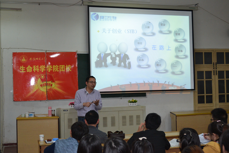 本网讯(生科院 李庆/曹治杰)科学规划人生经纬,奋斗成就美好未来。4月23日晚,学院团校暨学生骨干培训班邀请芜湖康卫生物科技有限公司董事长秘书、人力资源部经理党洋为在校青年学生作“大学生初进社会的规划”专题报告。报告在教学楼1410教室进行,院党委副书记刘振杰主持了报告会,院团委副书记郭志春与2011、2012级本科生240多人到场聆听学习。