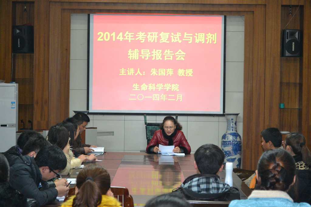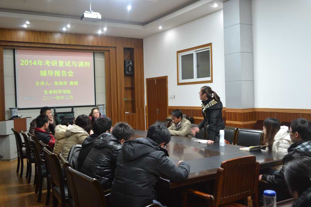 本网讯(李美倩 何所惧)为帮助考研学子顺利完成研究生复试与调剂,2月26日晚,学院在一楼会议室召开2014届本科毕业生考研复试与调剂辅导报告会。会议以座谈会的方式开展,科研副院长朱国萍应邀作为主讲人,为80余位到会的考研同学答疑解惑,会议由2010级辅导员夏齐平主持。