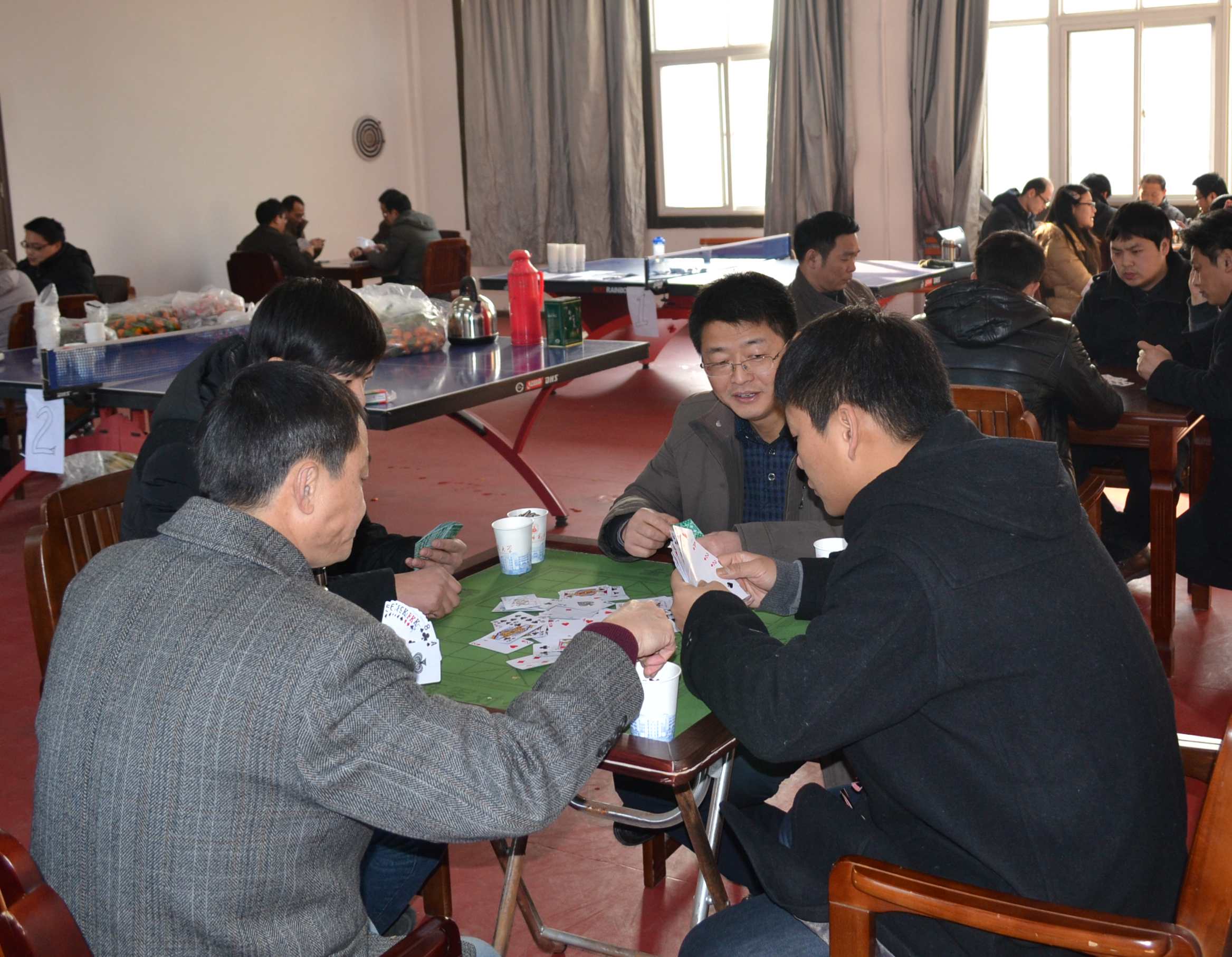 本网讯(院工会)为丰富学院教职工业余文化生活,加强教职工之间的沟通与交流,增强教职工的向心力和凝聚力,学院于1月16日在四楼工会活动室举办了第三届扑克牌(掼蛋)比赛暨第一届飞镖大赛。学院教职工积极响应院工会号召,踊跃报名参加,共有16对32位选手参与掼蛋比赛,18位选手参加飞镖比赛。