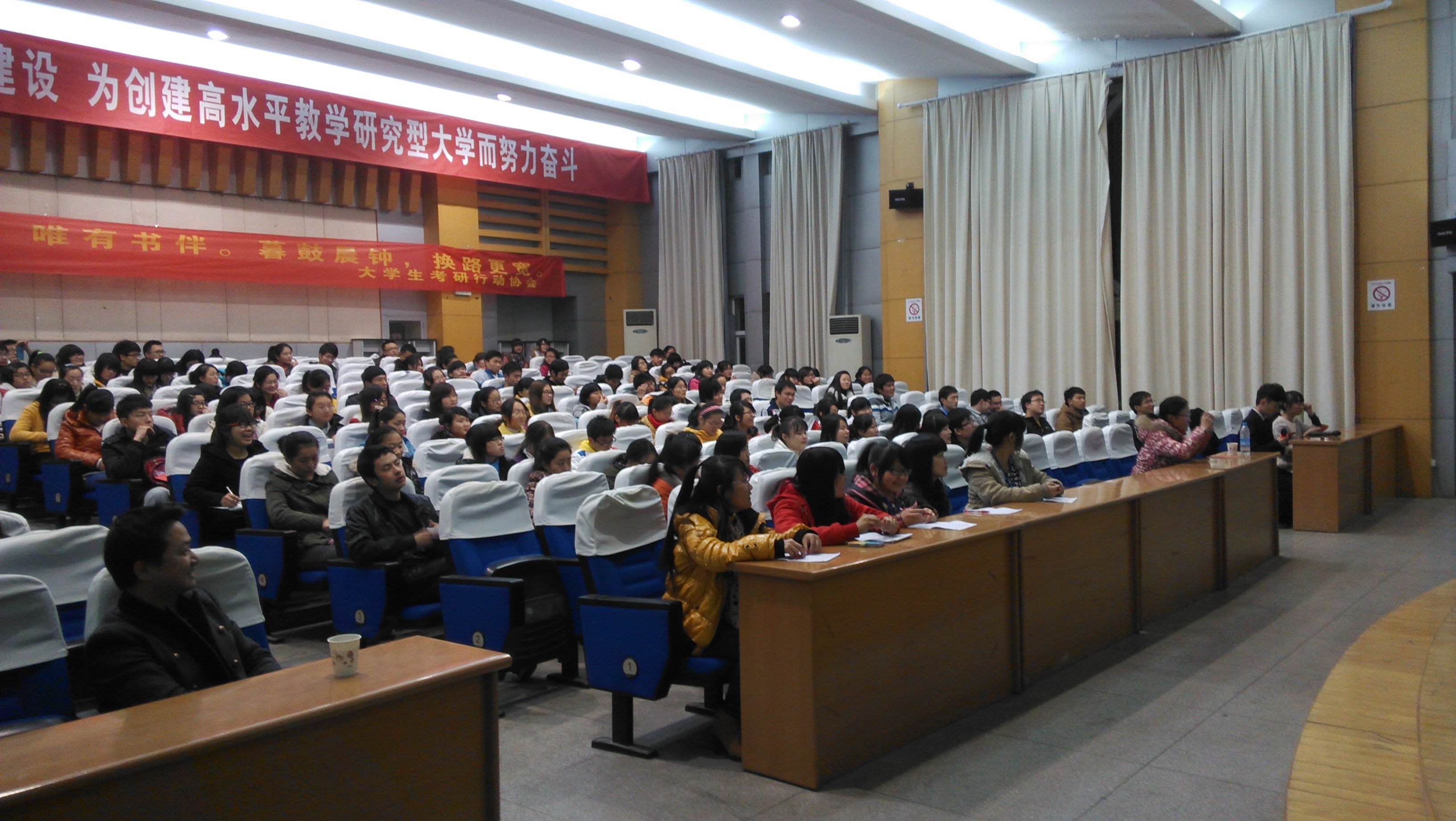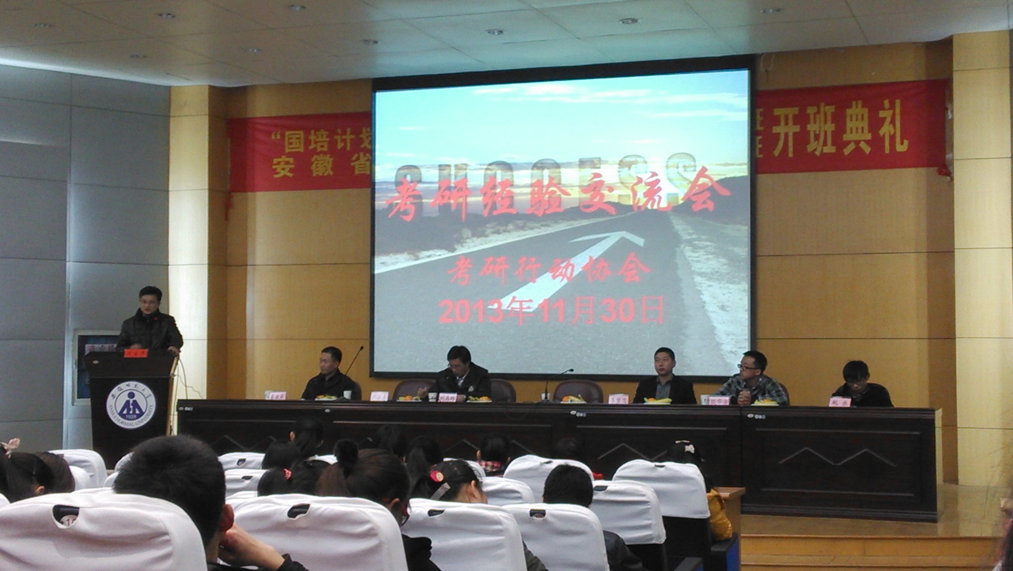 本网讯(大学生考研行动协会)师者传授考研技巧与方法,学长分享复习经验与感悟。近日,考研行动协会在田楼报告厅举办考研经验交流会。院党委副书记刘振杰,协会指导教师葛亚东,专业教师严云志教授、刘再群副教授和两百多名立志考研深造的同学参与经验交流。
