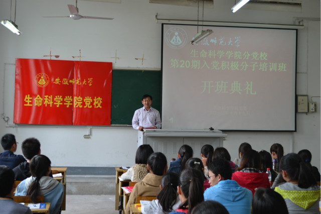 本网讯(生科院 何所惧)青春跟党走,共筑中国梦。10月19日上午,生科院分党校第20期入党积极分子培训班开班典礼在教学楼1403教室举行。学院党委副书记刘振杰、本期党校班主任何所惧、周科出席开班典礼,典礼由何所惧主持,学院第20期党校142名新学员参加仪式。