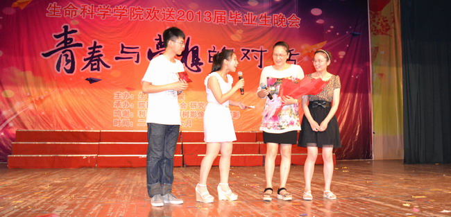 晚会演出过程中,研究生导师代表朱国萍副院长和本科毕业生辅导员贾瑞、张文君老师登上舞台接受毕业生代表的献花和感谢,并为毕业生们送上了送别寄语和美好祝福。毕业生们感慨万分,纷纷表示一定会铭记在母校点点滴滴的收获,在今后的学习和生活中奋发向上、再接再厉,为母校的发展添砖加瓦,为祖国的繁荣做出贡献。