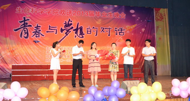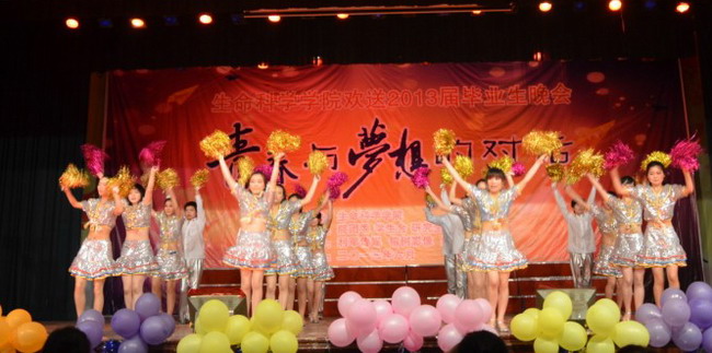 打拼精彩人生,共筑中国梦想。生科院2013届毕业生不仅在考研中取得丰硕成果,更加有付伟等同学走上选调生、大学生村官、支援西部等工作道路。为激励毕业生们扬帆起航,鼓励低年级学生砥砺奋进,院舞蹈团以苍劲有力的舞姿展现出中国崛起的坎坷历程,深刻诠释了当代青年所肩负的实现“中国梦”的《青春使命》;《青春梦·中国梦》则以诗歌朗诵的形式,用振聋发聩的语言呼吁大家用实际行动实现“中国梦”。《祖国之恋》唱出了对祖国的深深爱恋,流露着浓浓的赤子之情。符文倩等同学的扇子舞《待明春》动作舒展大方,表达了对毕业生的深深祝福。舞动青春,放飞梦想。两个多小时的晚会在一曲激昂深情的大合唱《毕业晚会》中顺利结束,整场晚会用高亢激昂的基调把毕业生送上了另一段人生征途。