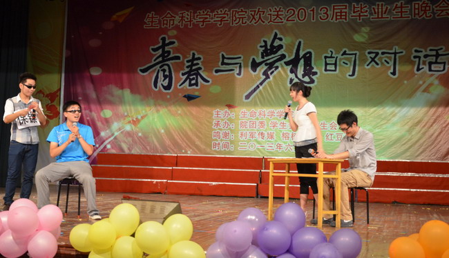 本网讯(生科院 毛琳 郭志春(文) 付伟(图))实现中国梦,青春勇担当。经过三个多月的精心筹备和认真排练,6月16日晚七点,3044am永利集团官网“青春与梦想的对话”欢送2013届毕业生文艺晚会在赭山校区大礼堂激情上演。火热的大礼堂灯光璀璨,掌声笑声高潮迭起。舞台上方“实现中国梦、青春勇担当,热烈欢送2013届毕业生奔赴新岗位、铸就新辉煌”条幅熠熠生辉,舞台两侧“送学子声声叮嘱语重心长、谢师恩句句感念情真意切”对联格外温馨。校党委常委、副校长李进华,党委组织部部长毕明福,学工部副部长、学生处副处长汪俊武,研工部副部长、研究生学院副院长汪健萍,校团委副书记陈莉,党委宣传部、校广播台台长邾强与学院师生千余人欢聚一堂,共同见证生科学子青春与梦想的对话,分享生科院人才培养的丰硕成果。