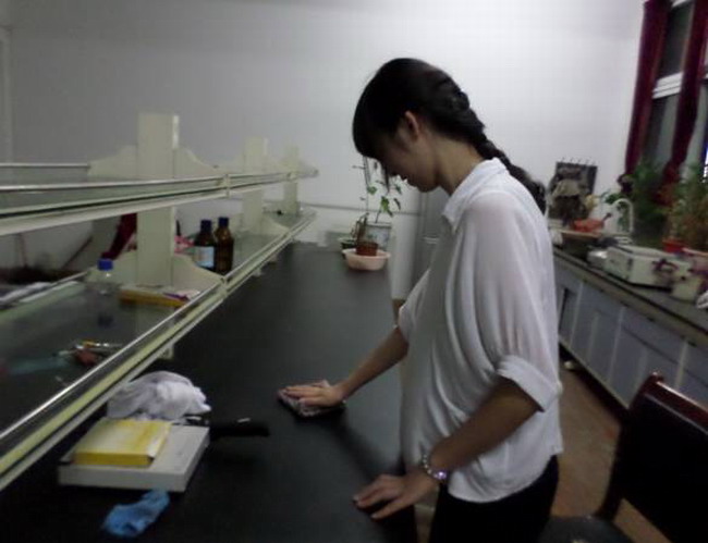 在各实验室负责人的带领下,毕业研究生怀着依依不舍的心情,发扬不怕脏不怕累的精神,仔细打扫实验室的每一个角落。有的把仪器上的灰尘擦拭的干干净净,有的将常年累积的实验废渣进行了处理,有的清扫了实验桌上和地面上的垃圾……经过三个小时认真的打扫,实验室面貌焕然一新。打扫结束后,每位毕业生都是汗流浃背,虽然辛苦,但他们的脸上都洋溢着快乐的笑容。
