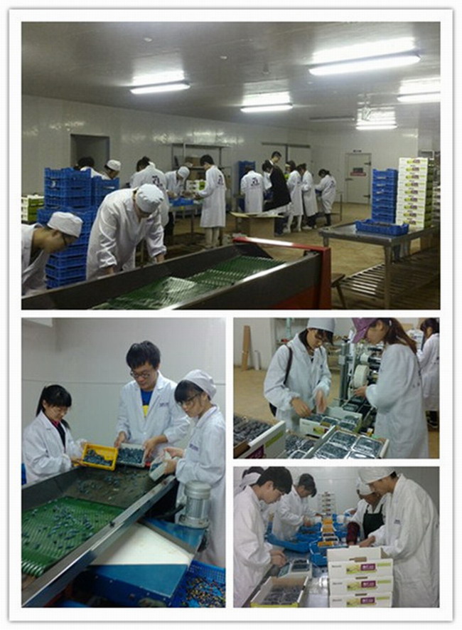 连日来,同学们在厂长梁海波和基地相关技术人员的指导下,参与了蓝莓采摘、分选、加工等多项工序。梁厂长亲自向同学们介绍蓝莓采摘对象特征、采摘方式、采摘次序、果实存放方式等注意事项,并示范带领大家采摘了蓝莓;团队成员在公司技术人员的热情指导下,分组参与蓝莓的分选、称重、装盒和标签粘贴等工作。