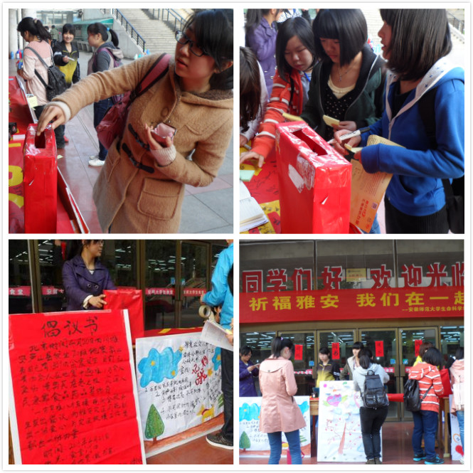 本网讯(生科院 方鑫 郭志春)4月20日8时02分,四川雅安芦山县发生7.0级地震,突如其来的灾害给当地造成了严重的人员伤亡和财产损失。地震无情,人间有爱,灾情发生后,生科院学子第一时间发出倡议,在赭山校区食堂门前广场和田楼广场开展“为灾区祈福,为芦山加油”的爱心募捐与心语寄愿的活动。