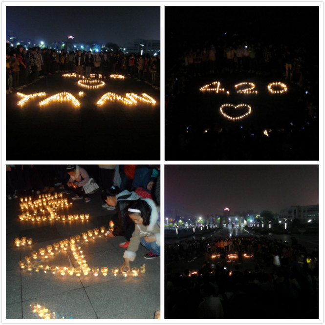 活动现场,学生会同学通过无线广播向过往同学传递雅安灾区最新的伤亡情况,带领学生们通过填写心语卡片、爱心募捐等方式为灾区人民祈福,呼吁大家共同行动、汇聚爱的力量,为雅安人民送去关爱与希望!晚上9:30,同学们又在田楼前广场点燃蜡烛,为灾难中逝去的同胞哀悼,愿逝者安息,生者平安!
